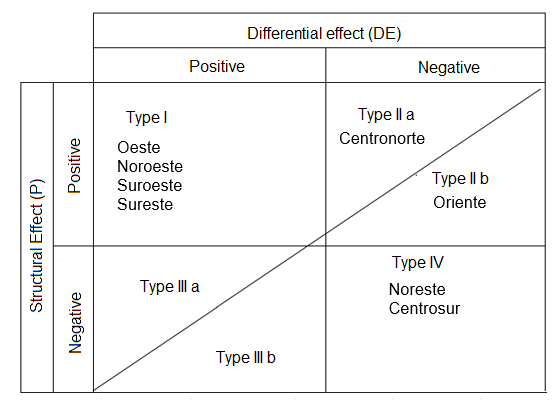 The net change reflects a more complex mix of factors, incorporating both the total and structural effects. Here, we observe that while regions such as the Northwest and Southeast have managed to maintain a positive net change (60,294.47 MP and 16,012.46 MP, respectively), other regions have experienced a decrease. Notably, the Centrosur region has experienced a significantly negative net change (-33,789.51 MP), highlighting weak territorial competition and slower growth than the national average. This suggests an urgent need to review and adjust its economic strategies to revitalize its competitiveness in the national market. Figure 2 shows the classification of regions according to Boudeville and Montefiore (1966).