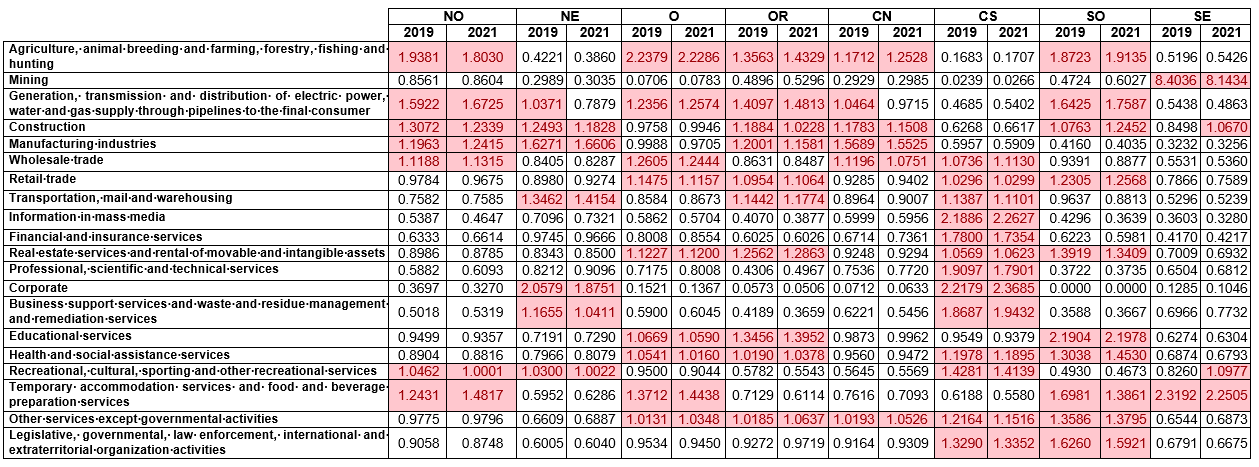 For example, it can be noted that the Southwest region stands out significantly in the mining sector with an index of 0.0074, which could indicate a notable specialization or focus in this area. In addition, this region also shows a strong presence in the "Temporary accommodation and food and beverage preparation services" sector, with an index of 0.0138.