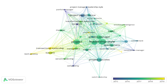 The main theme of the articles was LSs within PM, the main focus of the articles varied, some aimed at finding a relationship between LSs and project performance or success, others focused on the role of a specific LS of the PM, while others prioritized comparing LSs to find the most effective. There were many themes and keywords in the article, Figure 3 depicts a text-based network diagram of the most frequent words mentioned in the title, abstract and keywords of the analyzed articles.