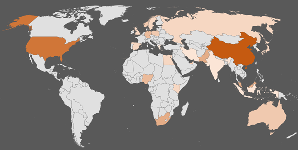 The analysis of the collected data revealed interesting insights into the geographical distribution and publication timelines of the articles under scrutiny. The majority of articles originated from the United States, followed closely by China. A detailed breakdown of the percentages corresponding to each region can be found in Figure 2.
