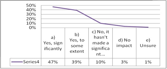Impact on performance: The majority of respondents (85%) believed that digital marketing positively impacted the overall performance of SMEs in North Macedonia. Of these, 47% reported a significant positive impact, while 39% noted a positive impact to some extent, and 14% of them think that digital marketing has no impact on performance. The results are shown in the Figure 5.