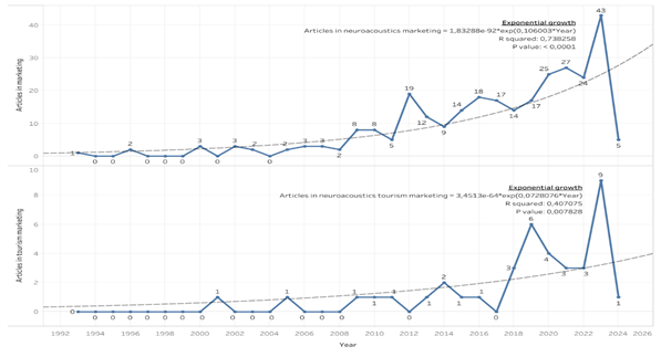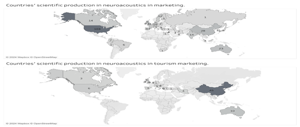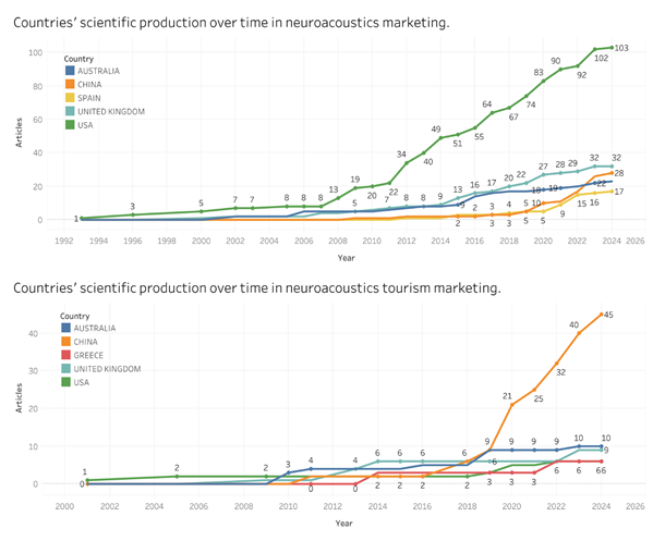 Different bibliometric indicators have been analysed, including the distribution of years of publication, Price’s index, number of citations, source of publication, research areas, research methods, and co-occurring keywords, among others. This comprehensive study aimed to clarify the main characteristics and trends in neuroacoustics research across both domains. The first neuroacoustics article in the marketing field was published in 1993, exhibiting an annual growth rate of 5.33%. Additionally, neuroacoustics in tourism marketing emerged as a more recent subfield, with only twenty-three years of history (RQ1). As observed in many other disciplines, the United States, the United Kingdom, China, and Australia are the most significant contributors, highlighting the need to foster this discipline in other countries.