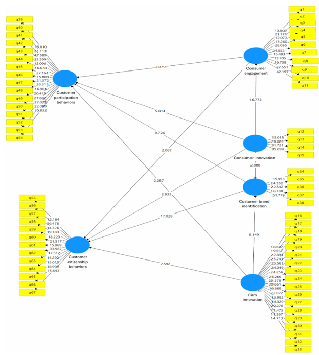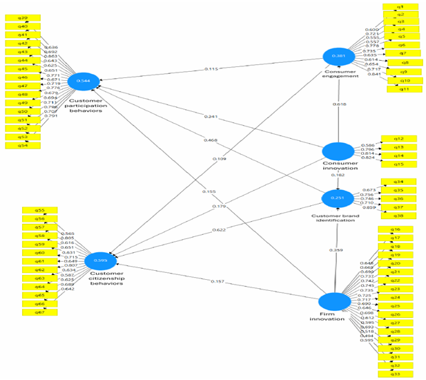 The convergent validity and reliability results for the constructs were satisfactory. The Average Variance Extracted (AVE) values ranged from .44 to .58, exceeding the acceptable threshold of .40 for exploratory research. The Cronbach’s alpha coefficients ranged from .75 to .93, indicating good internal consistency for all constructs. Specifically, the AVE values were .46 for customer engagement, .58 for consumer innovativeness, .44 for corporate innovativeness, .56 for customer identification, .44 for customer citizenship behaviors, and .51 for customer participatory behaviors.