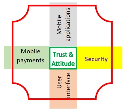 The above figure is based on the published framework included in Appendix A. The framework clearly demonstrates the interrelationships between and among the six factors in the middle of the figure. The four rectangular are the four technological factors of security, accessibility of mobile applications, support for mobile payments, and user interface design. The middle small square represents the two intervening or moderating factors of trust and attitudes, indicating that both interact with the four technological factors and will be embedded throughout the discussions on the four factors. Finally, the outer line, shown in ‘Red’ color, represents the overlap among the four technological factors, but to a lesser degree.