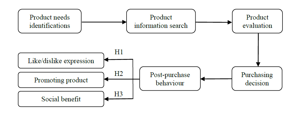 Having a modification of the CDM model, the study seeks to concern the last process (post-purchase behaviour) and extends with three constructs namely like and dislike expression, promoting the product voluntarily, and the gained social benefits. Figure 1 is the research framework that shows the employment of instruments and its sequence of consumer decision-making.