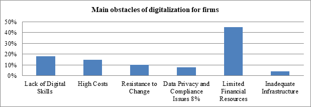 Figure 5 provides updated percentages for the main obstacles that firms, particularly SMEs, face in digitization. The data underscores that limited financial resources are the most significant obstacle (45%) for SMEs, far outstripping other factors. Lack of digital skills (18%) and high costs (15%) are also major barriers, while resistance to change (10%) and data privacy/compliance issues (8%) pose substantial challenges. Although fewer firms struggle with inadequate infrastructure (4%), it remains an important factor to address. These insights highlight the need for comprehensive support mechanisms, including financial aid, training programs, and robust infrastructure development, to facilitate effective digital transformation for SMEs.