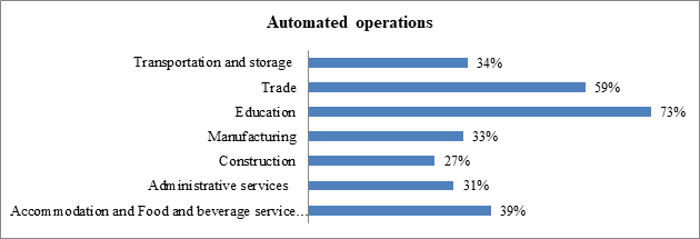 These percentages likely represent the extent to which each sector has integrated digital technologies into their operations. For instance, the education sector has a high adoption rate of 73%, reflecting significant digital transformation efforts, possibly accelerated by the COVID-19 pandemic and the shift to online learning, followed by trade at 59%. In contrast, the construction sector shows a lower adoption rate of 27%, indicating more space for digital innovation. Figure 2 shows the percentages of automated operations by sector.