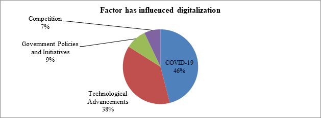 In recent years, several key factors have influenced digitization across industries, particularly in SMEs. The pandemic has been a significant driver of digital transformation. The survey indicated that over 46% of companies accelerated their digital transformation efforts in response to COVID-19, with many organizations adopting remote work, online services, and digital communication tools to maintain operations. Technological advancements have influenced 38% of the companies, and approximately 16% of organizations were influenced by government and competition. These factors are shown in the Figure 3.