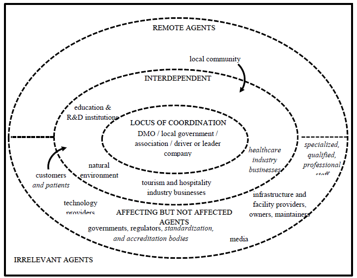 Outside of the ecosystem remain the irrelevant agents – unwilling to cooperate or lacking resources and interest to participate in the health and recreation tourism product. They might represent parts of the tourism and healthcare industries or other local actors without relevancy to the destination ecosystem.