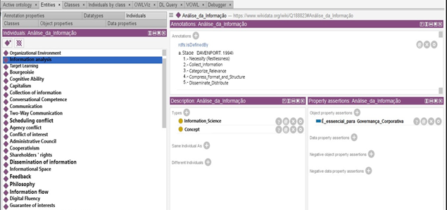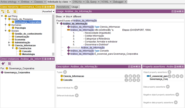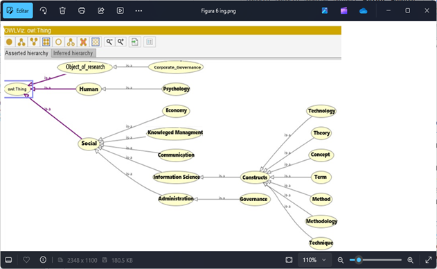 Following the methodological path, arguments such as factoring and induction, performed automatically by Protégé, were increased during the registration of entities, properties, and instances by analyzing synonyms, using homograph to focus on concepts of interest to management, and polysemy to identify the concept most closely related to the disciplinary entities. These resources for dealing with terms facilitated the evolution of the taxonomy, as shown below.