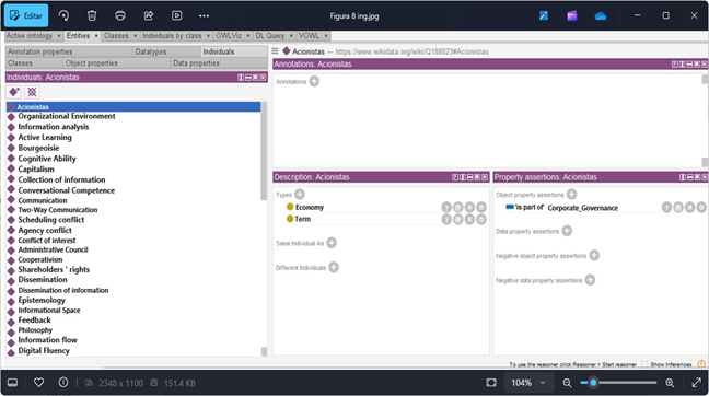 These logical arguments shown in Figure 9 help the Protégé application to infer automatically, expanding the set of relationships, discovering axioms or assertions, as well as establishing relationships between the items registered in the taxonomy.