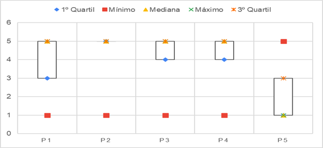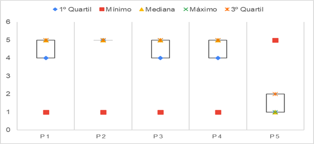 By consolidating the results of the second questionnaire in a Box Plot graph (see Figure 2), it can be inferred that the distribution of the median remained concentrated in the maximum values; however, the boxes can be seen to have narrowed, which can be deduced, ceteris paribus, that there was a gain.