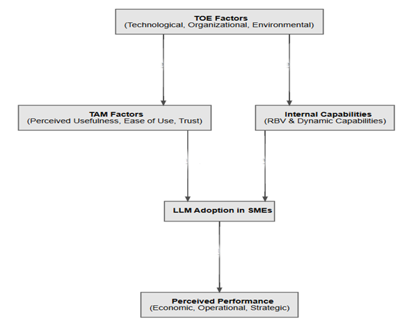 Taken together, these frameworks build a robust, integrated model that captures the multifaceted nature of LLM adoption in SMEs. They offer a lens not just for academics but also for managers and policymakers trying to navigate the messy, uncertain terrain of digital transformation in resource-constrained settings. Figure 1 presents conceptual framework for LLM adoption in SMEs.