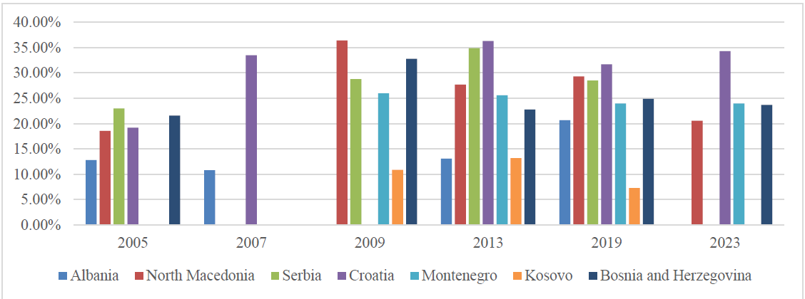 These figures reveal pronounced cross-country differences in women’s economic engagement. Kosovo records the lowest female labor-force participation (42.3 percent) and women-owned businesses (18 percent), pointing to significant institutional and cultural constraints. By contrast, Serbia and Albania demonstrate comparatively higher rates of participation and business ownership, suggesting more supportive institutional environments. These disparities mirror broader dynamics in the region, where institutional voids, cultural norms, and unequal access to resources continue to limit women’s entrepreneurial opportunities.