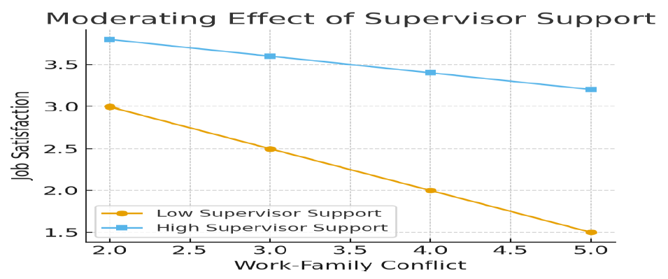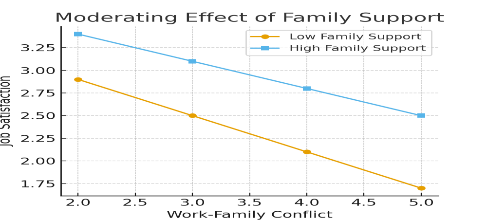 Figures 1, 2, and 3 illustrate the interaction effects of supervisor, co-worker, and family support on the relationship between work-family conflict and job satisfaction. The plots show that job satisfaction decreases as work-family conflict increases; however, this decline is considerably less steep when supervisor support is high, demonstrating a strong buffering effect. Co-worker support also mitigates the negative impact of work-family conflict on job satisfaction, though to a lesser extent than supervisor support. Family support shows a comparatively weaker moderating influence, as job satisfaction continues to decline noticeably with increasing work-family conflict, even when family support is high.