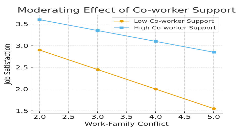 Co-worker support also moderated the WFC-job satisfaction relationship, though less strongly than supervisor support. Given that nursing is highly collaborative, colleagues who share tasks and provide emotional encouragement help alleviate stress and improve morale. However, because co-workers have limited authority to alter schedules or workloads, their influence is primarily emotional and social rather than structural.
