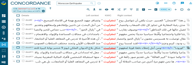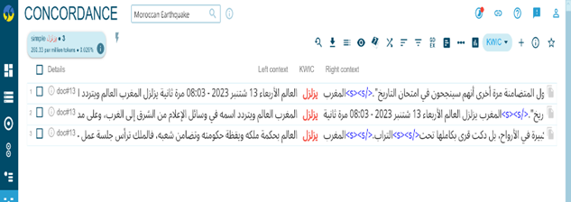 The earthquake can reignite solidarity, unite people, and emphasise the value of support and unity in trying times. Furthermore, mentioning Moroccans' crisis resilience suggests a spirit of fortitude and resolve in the face of difficulty. In summary, the research indicates that this incident has had a noteworthy effect on the community, highlighting the significance of uniting and supporting one another in hard times. Additionally, the term "Tamghrabit" likely refers to a sense of community or collective identity within the context of the "Al-Hawz Earthquake," which may be a specific event or situation. The reference to a shared love of goodness and solidarity highlights the significance of uniting to support one another and advance positive values, implying a close relationship among those impacted by or participated in this incident. According to this research, the community's reaction to «Al-Hawz Earthquake " is defined by a common dedication to kindness, solidarity, and support among one another when faced with difficulties, as the concordance lines of both keywords confirm, as presented in Figures 6 and 7: